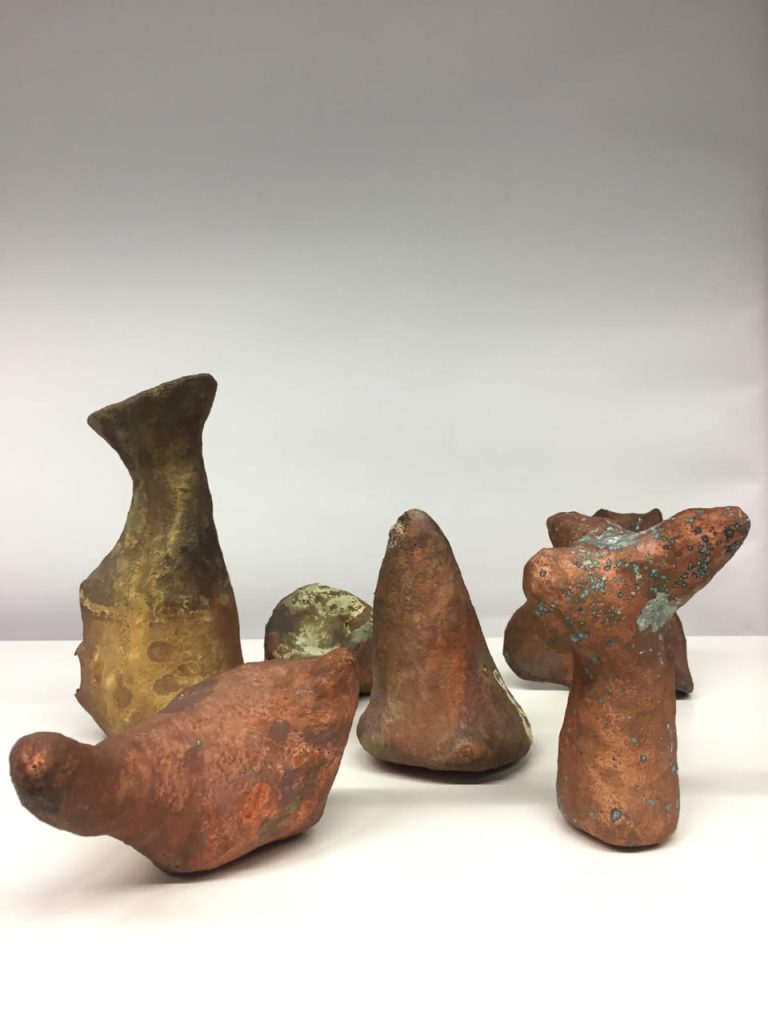 Wire, papier-mâché, wax, copper, 10 objects 10–23 cm high and 12–19 cm wide