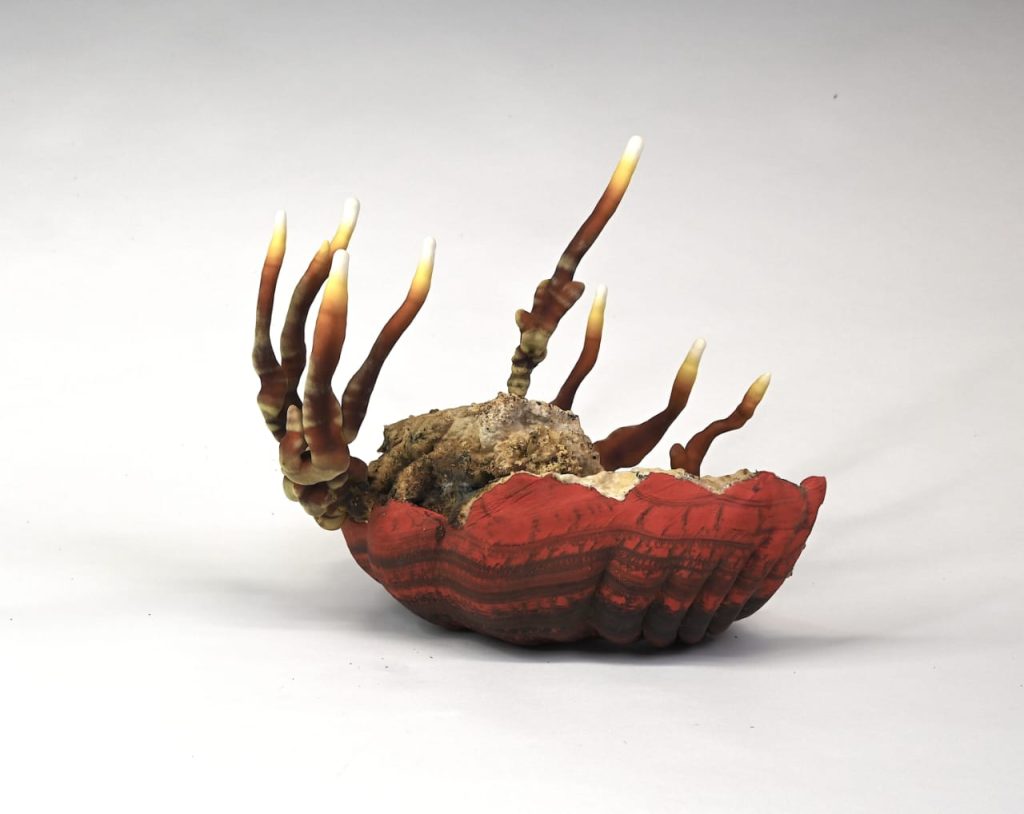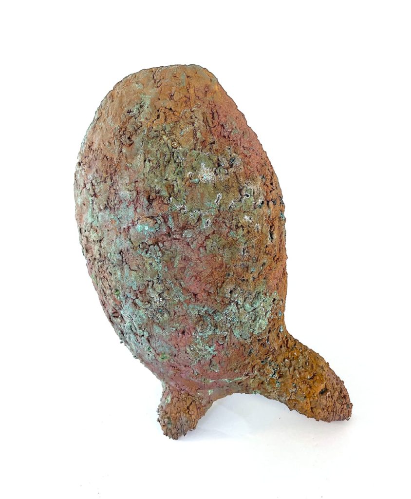 La transformation est un thème récurrent dans mon œuvre, non seulement au sens matériel, mais aussi au sens symbolique. Mes sculptures présentent des êtres et des formes abstraites qui résistent à une interprétation claire. Elles apparaissent à la fois familières et étranges, archaïques et futuristes, vulnérables et puissantes. Ce sont des corps façonnés à partir de divers matériaux, parfois dotés de surfaces semblables à du corail, altérées par des processus galvaniques, marquées par le temps et la nature.