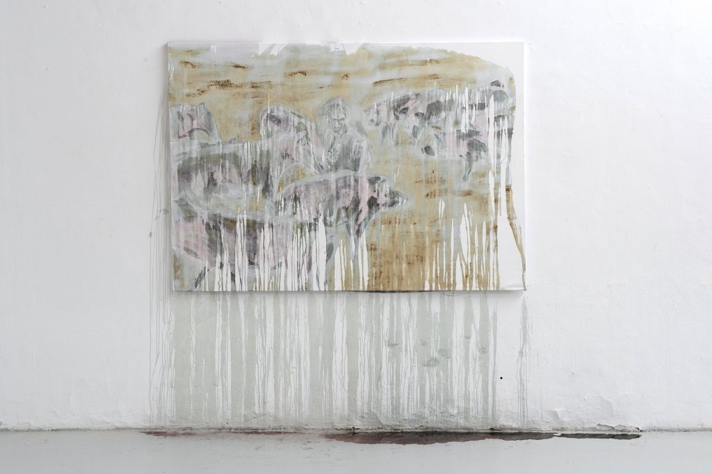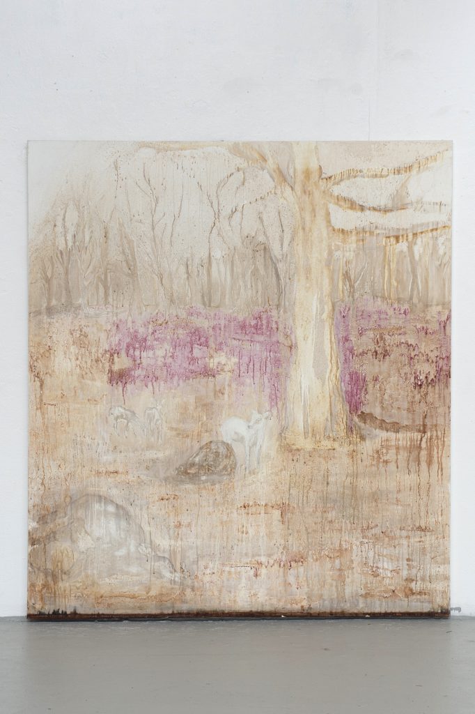 Gouache blanche, jus de citron, bicarbonate de soude et vin rouge sur toile, 200 x 140 cm