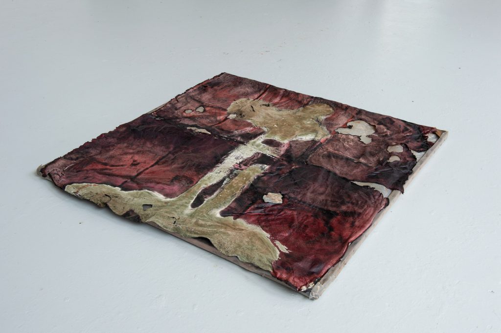 Gouache blanche, jus de citron, bicarbonate de soude, et vin rouge sur toile, 170 x 180 cm