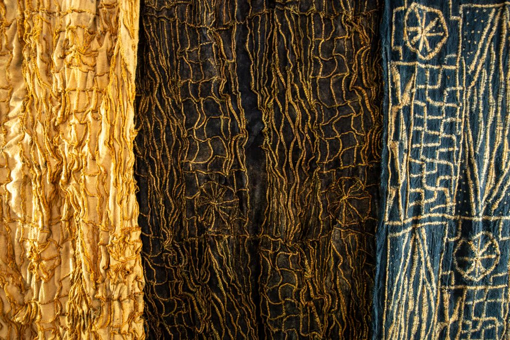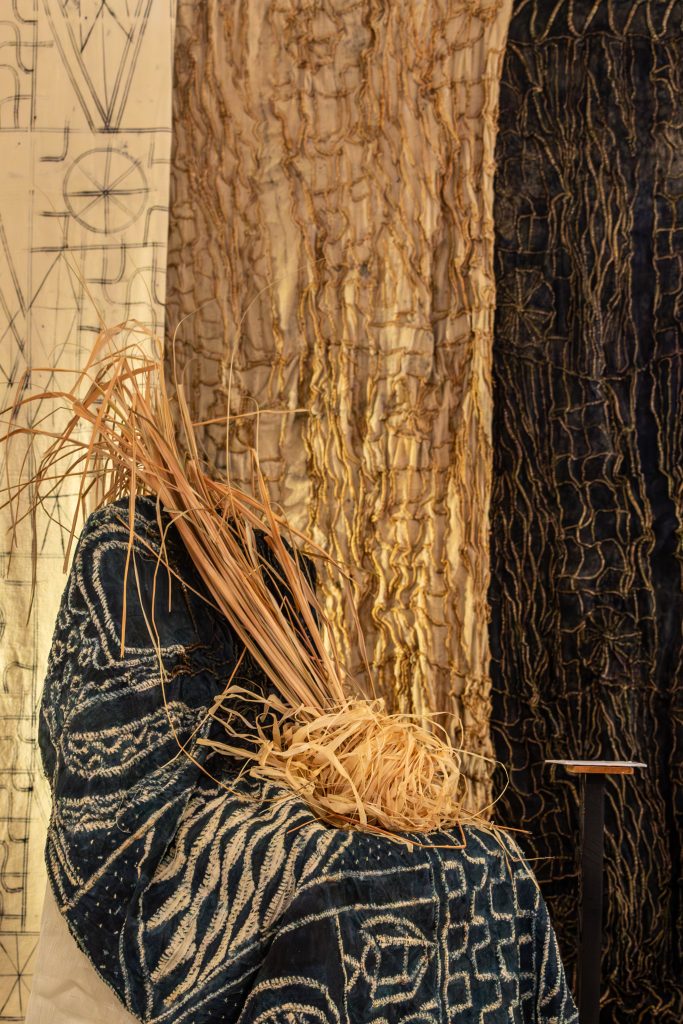 Tissage en ligature travaillé par le geste selon la technique de tissage de reserve par ligature. Tissus en coton, raphia, teinture 4 bandes chacune de 1 metre par 4 metres de hauteur Enregistrements sonores Maison des Deux Terres, Residence a Grignan, juin 2024