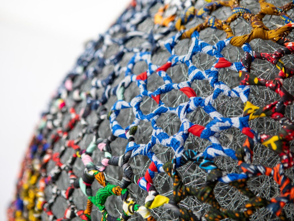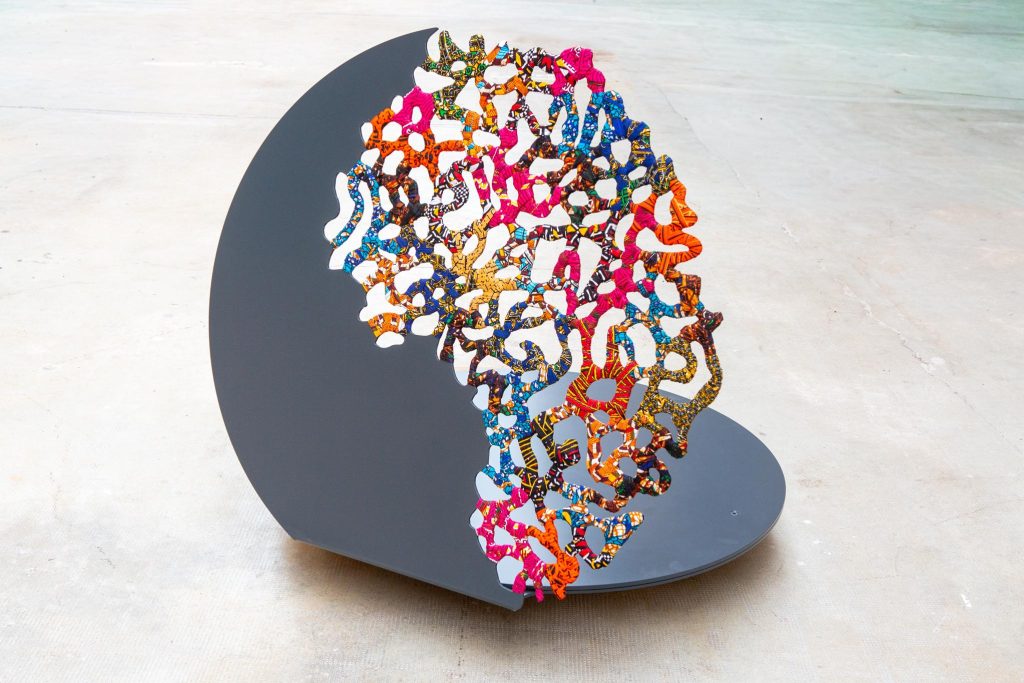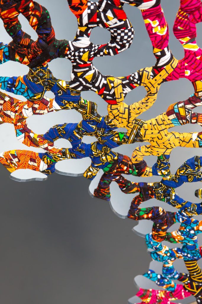 Tissage en ligature travaillé par le geste selon la technique du tissage traditionnelle du raphia. Acier decoupe au laser. Metal, tissus wax industriels. Ø 1 m, 90cm de hauteur, 113 kg Tiers lieu de l’Usine, centre d’art et pepiniere d’ateliers pour artistes et artisans, Poet-Laval