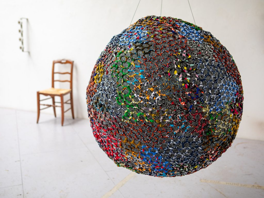 Tissage en ligature travaillé par le geste selon la technique du tissage traditionnelle du raphia des artisanes Bamilekees. Grillage à poule, tissus industriels reprenant les symboles du “Ndop”, l’etoffe traditionnelle de l’ethnie Bamileke. Diametre 87cm Maison des Deux Terres, Résidence a Grignan, juin 2024
