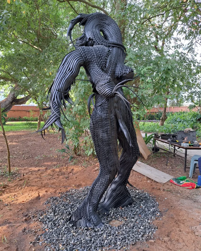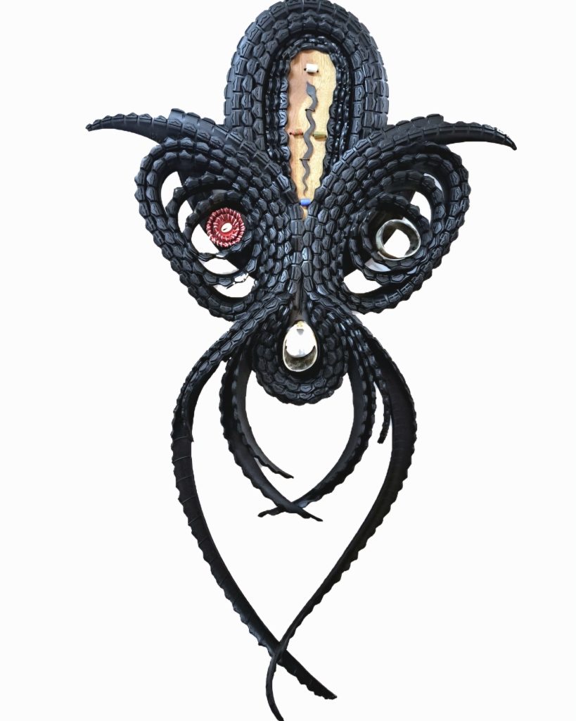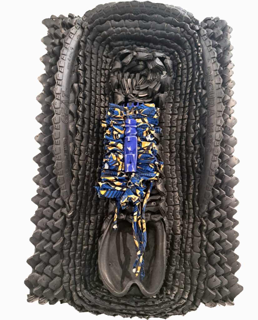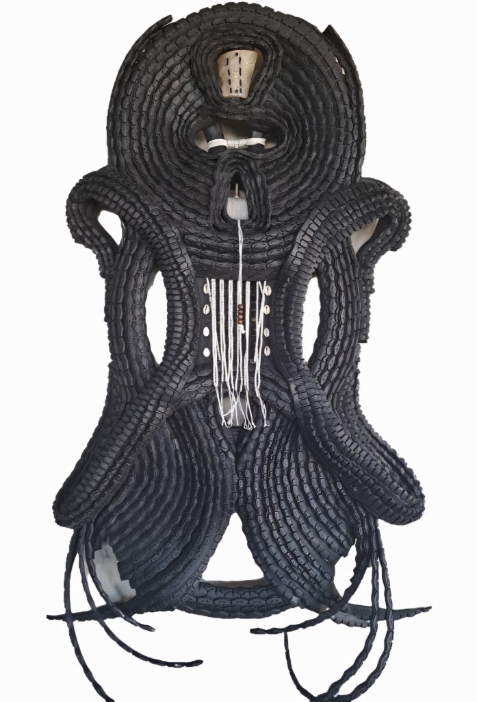 L’Artiste : Je réalise des sculptures à partir de matériaux recyclés, notamment des pneus en caoutchouc. Ce choix est né de l’observation de mon environnement au Bénin où les pneus abandonnés au bord des routes sont omniprésents. Non recyclables, ils polluent progressivement les sols et posent un problème sanitaire en devenant des foyers propices aux moustiques, vecteurs de nombreuses maladies dont principalement par le paludisme.