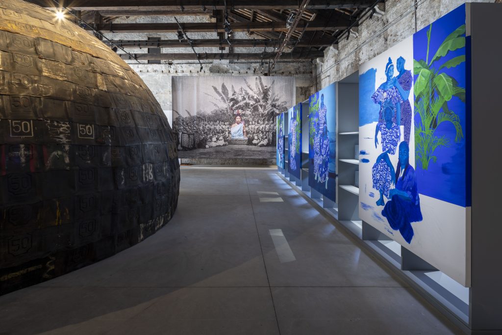 Au niveau de la scénographie, une exposition à Venise n’est pas semblable à une exposition muséale. Les visiteurs vont voir énormément de pavillons dans la journée, ils seront parfois fatigués, donc il faut trouver une manière de capter leur attention et de proposer quelque chose de différent des autres. Alors, on a essayé de proposer un espace qui soit avant tout un lieu où on reçoit du public et non un espace que l’on traverse comme dans d’autres pavillons. C’est un espace où l’on peut s’asseoir, prendre le temps de regarder librement les œuvres, de discuter avec d’autres visiteurs. Et après, ce qui m’a aussi intéressé dans le projet, c’est de mettre en correspondance des patrimoines éloignés par l’histoire et la géographie dans un même espace. Par exemple, toutes les assises qui étaient disposées tout autour du pavillon ont été réalisées sur place par des artisans de Venise, avec des enduits propres au patrimoine vénitien et qui ressemblent à des enduits en terre que l’on peut faire en Afrique de l’Ouest.