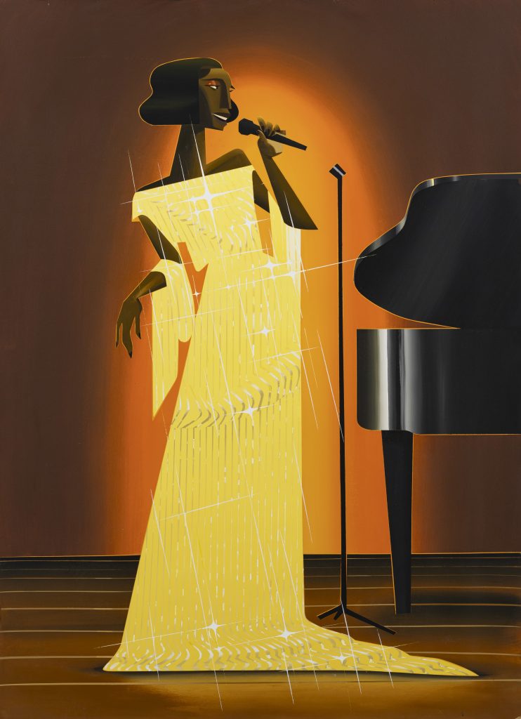 L’arrière-plan est nu, simplifié à l’extrême, source de lumière ou outil de contraste. Au centre, un corps croît et s’étire comme un trait. La touche du peintre se situe dans la ligne. Les verticalités s’accumulent dans les postures de ces silhouettes longilignes, dans les motifs des vêtements et les objets. Les portraits attirent irrésistiblement car cette grandeur a quelque chose de spectaculaire. Elle s’articule sur les mêmes rouages que le portrait politique peint par Philippe de Champaigne, d’un cardinal Richelieu théâtral tout enveloppé de rouge et de longueurs. Son visage, point blême, posé au-dessus d’un corps droit comme un i, nous regarde de haut. Les visages de Terence Maluleke jouent avec cet aspect théâtral mais ils n’expriment pas la domination. Il est vrai, ils sont graphiques : nets et durs. Cette dureté est l’expression d’une force dont le tranchant ne s’émousse pas, mais elle dit le caractère et non l’intention. Altiers, c’est certains, mais point d’excès autoritaires. Ils sont aussi impassibles, figés comme des masques. Masques traditionnels ou masques de pudeur. La narration glisse alors sur ces corps perchés ou assis, habillés de jaune vif, d’écarlate, de touches métalliques. Ils sont statiques et délicatement lamés d’or. Ce peut être un pendant aux figures argentées de Tamara de Lempicka (voilà pour l’inspiration occidentale). Les personnages, lambda et diva, sont en quelque sorte statufiés, ils se laissent facilement observer notamment parce qu’ils se détachent franchement de l’arrière-plan. Les portraits sont isolés mais ils portent plusieurs voix. Cette même chanteuse rappelle un peu celles qui chatoient dans les collages et les peintures de l’artiste sud-africain renommé, Sam Nhlengethwa.