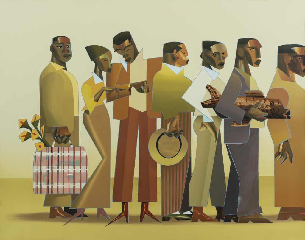 Toutefois, les figures qui naissent sous le pinceau de Terence Maluleke ne concentrent pas l’essentiel du sens, le récit s’épaissit tout autour. Alors on s’approche, on met littéralement le nez sur les symboles. Et les objets sortent du lot. Dans le tableau Yima, une petite foule de personnages élégamment vêtus et debout les uns derrière les autres, attend. La file s’étire jusqu’à sortir du cadre. Il s’agit d’une scène quotidienne, anecdotique, comme celles qu’a pu peindre, des années plus tôt, Gerard Sekoto, réalisant alors les premières scènes de genre urbaines noires, sud-africaines. L’un des hommes rompt les lignes verticales et capte sitôt le regard : il porte dans sa main la sculpture en bois d’un poisson. Cette petite sculpture est traitée différemment par le peintre. Moins stylisée, plus réaliste, elle détonne. Il s’agit d’une référence aux œuvres de Jackson Hlungwani. Cela renvoie même précisément à un souvenir d’enfance : quand l’artiste très influent de Limpopo offrait l’un de ses ouvrages au jeune Terence. Le cadeau se couvrira plus tard d’un éclat particulier, impulsant chez lui, un déclic artistique. L’histoire individuelle rencontre (et raconte) sur la toile, l’histoire commune, comme les rivières viennent nourrir les mers. Les ouvrages de Terence Maluleke illustrent moins les individus que leurs relations. D’ailleurs les individus sont anonymes : ce sont les bannières d’un quartier, Soweto, de sa population, de sa culture.